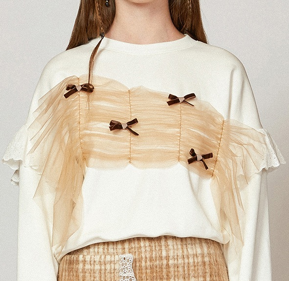 选用高品质的纯棉面料,既舒适柔软,又保暖日常,胸口斜拼接网纱并点缀蝴蝶结装饰,袖身拼接白色镂空花边,少女感十足