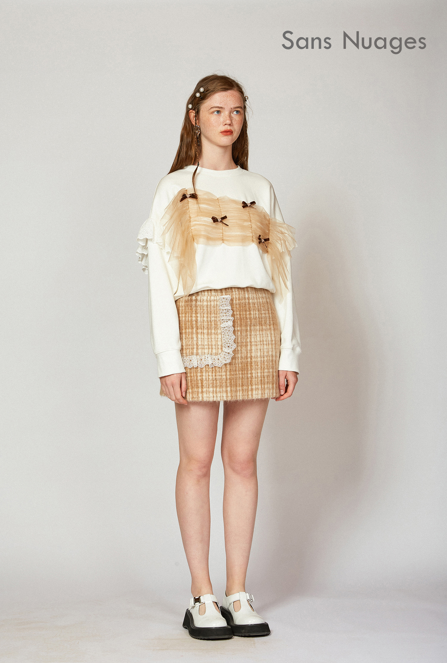 白色抽褶网纱卫衣